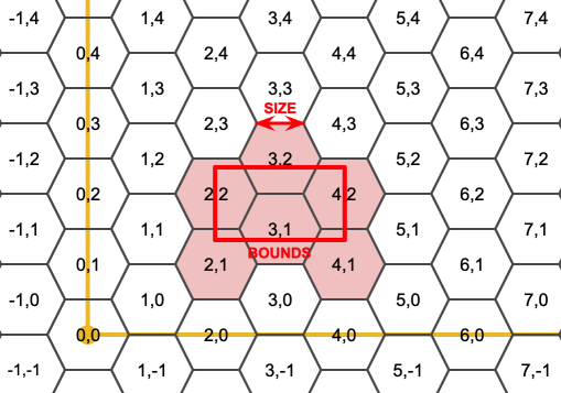 Starts with the concept of a hexagon tiling of the plane. (Not a hexagon tiling of the globe, this is not the H3 tiling scheme.) For a given planar SRS, and a given edge size, starting at the origin of the SRS, there is one unique hexagonal tiling of the plane, Tiling(SRS, Size). This function answers the question: what hexagons in a given Tiling(SRS, Size) overlap with a given bounds.