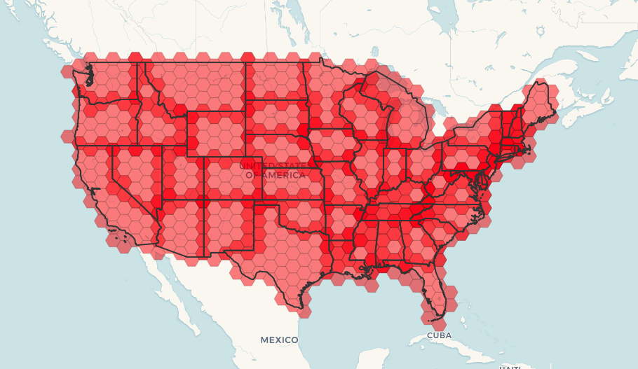 Tiling states results in a hexagon coverage of each state, and multiple hexagons overlapping at the borders between states.