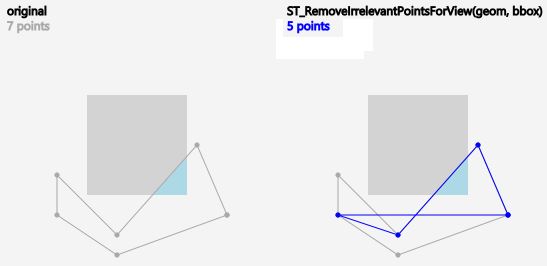Example: ST_RemoveIrrelevantPointsForView() applied to a polygon. Blue points remain, the rendering result (light-blue area) within the grey view box remains as well.