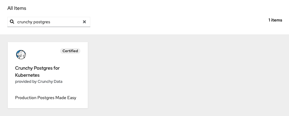 Crunchy Postgres for Kubernetes can be installed on OpenShift through the OperatorHub point-and-click experience. Under Operators > OperatorHub, search for Crunchy and you’ll find the Certified installer. Choose the installer and consider installing in a specific namespace.